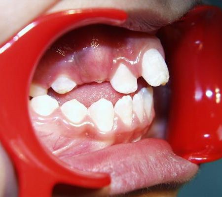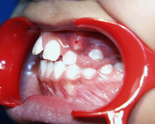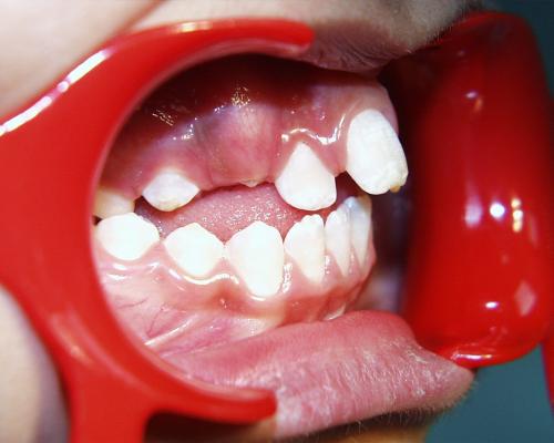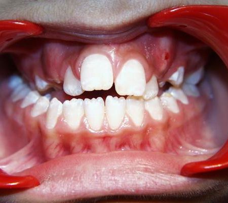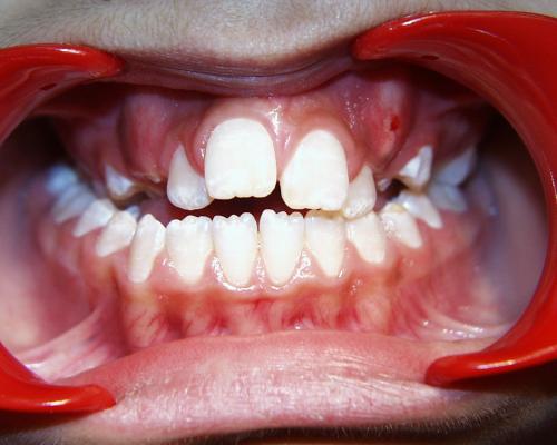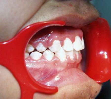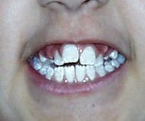 Beim nächsten Fallbeispiel war der Oberkiefer deutlich zu schmal im Verhältnis zum Unterkiefer, der Biß war frontoffen und die oberen Schneidezähne standen sehr unregelmäßig bei einer auffallenden Mittenverschiebung nach links.