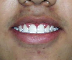 Die Zahnbogenmitte wurde eingestellt, die oberen Eckzähne eingeordnet und nach Einbeziehung des unteren Zahnbogens der offene Biß beseitigt.