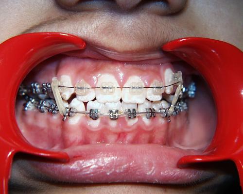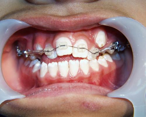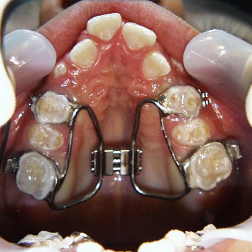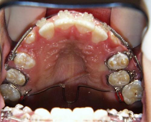 Zunächst wurde der obere Zahnbogen geweitet und mit dem Ausrichten der Schneidezähne begonnen.