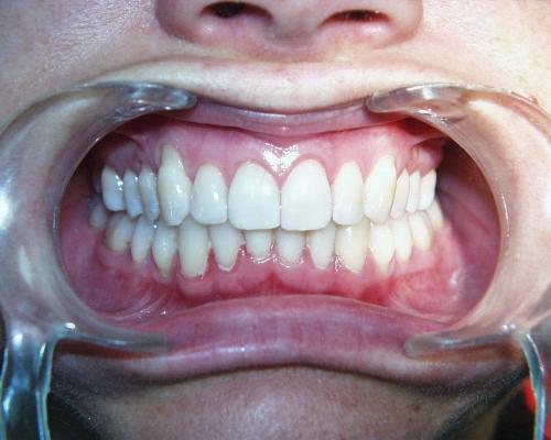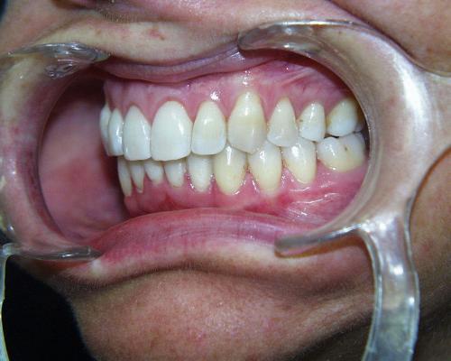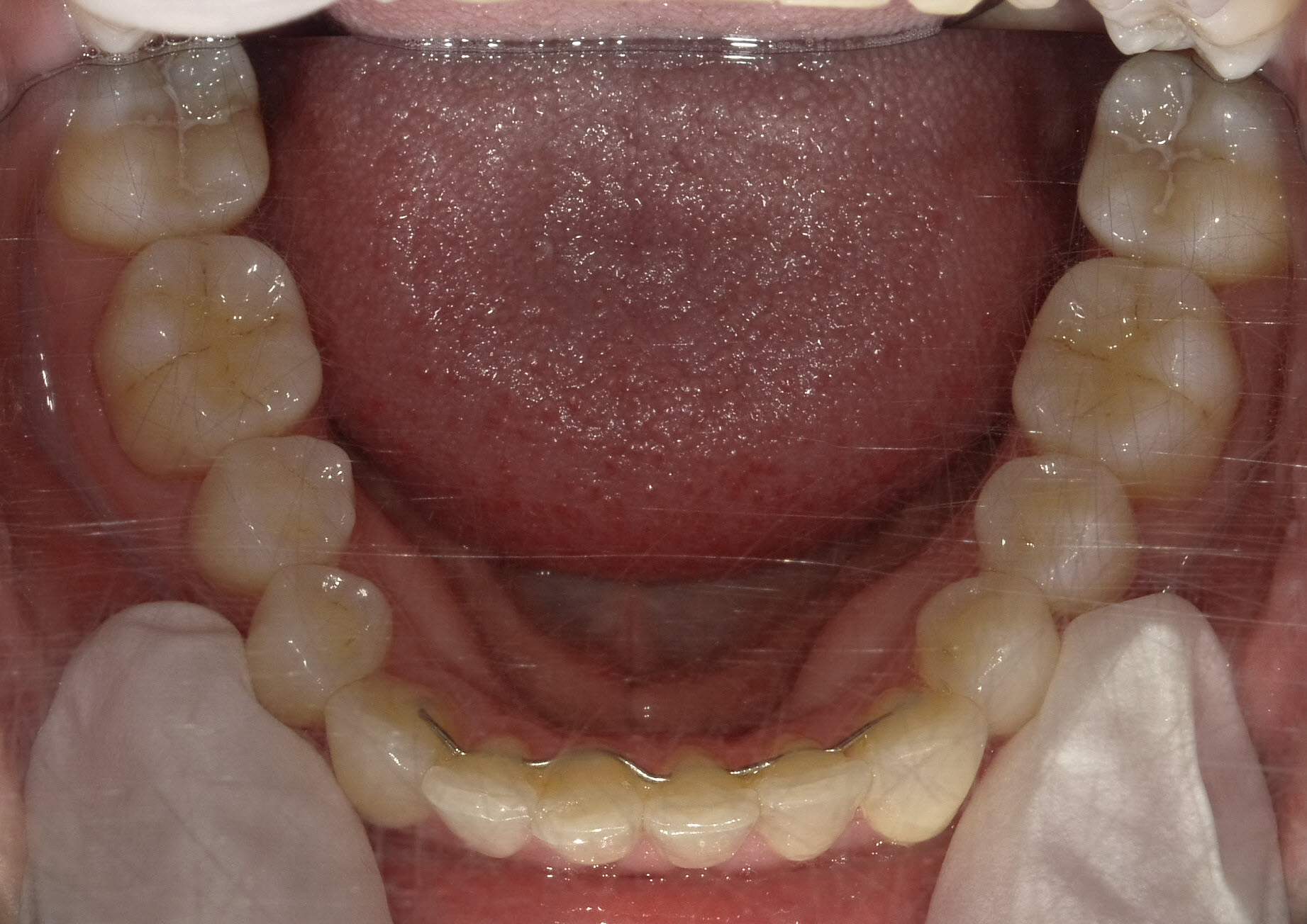 Fallbeispiel 4 zeigt einen häufigen Befund bei erwachsenen Patienten: Die Stellung der Schneidezähne hat sich in beiden Zahnbögen im Laufe der Jahre erkennbar verschlechtert, und die Patienten fühlen sich dadurch zunehmend beeinträchtigt. Die in diesem Beispiel nur geringgradigen Abweichungen im Oberkiefer ließen sich mit nahezu unsichtbaren, herausnehmbaren Alignerschienen behandeln, während die Korrektur der stärkeren Schachtelstellung der unteren Frontzähne eine festsitzende Zahnspange erforderte. Auch hier ist nach der Korrektur die Verwendung innenliegender aufgeklebter Stabilisierungsdrähte über viele Jahre hinweg ratsam.