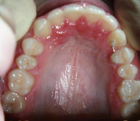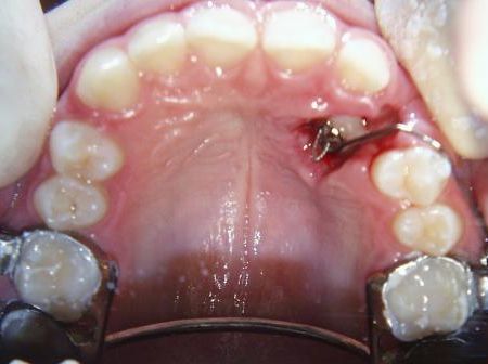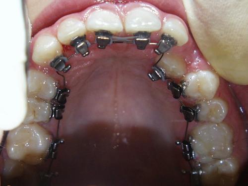 Fallbeispiel 6 zeigt die Einordnung eines gaumenwärts verlagerten linken oberen Eckzahns mittels Lingualapparatur nach chirurgischer Freilegung.