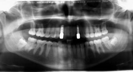 Vor Entfernen der festen Zahnspange mußte sichergestellt sein, daß die Lücken für die Zahnimplantate ausreichend breit und auch die Wurzeln der die Lücke begrenzenden Zähne ausreichend parallel waren (linkes Bild). Rechts die Situation nach Einsetzen der endgültigen Versorgung.