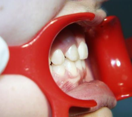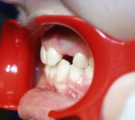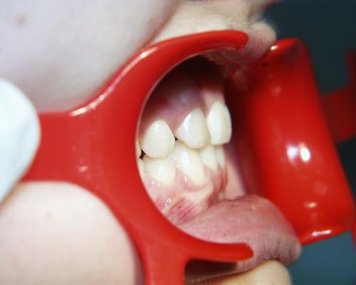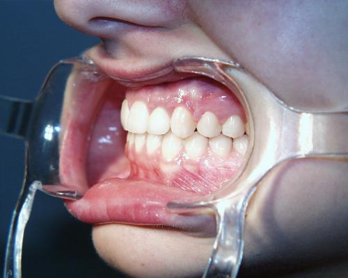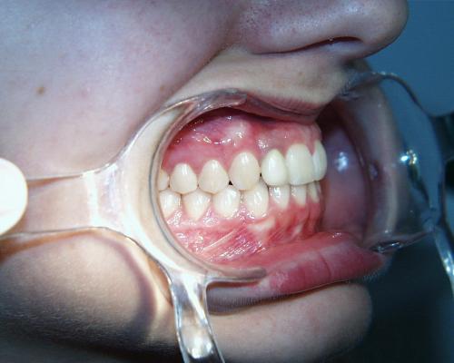 Die Backenzähne wurden mit einer im Gaumenbereich angebrachten, festsitzenden Apparatur zunächst nach hinten bewegt, bis die Verzahnung richtig eingestellt war. Dies war nach ca. 1 Jahr erreicht. Anschließend wurde die Bracketspange eingesetzt. Der Aufbau des rechten Eckzahns wurde entfernt, die Lücken mit über den umlaufenden Drahtbogen gestreiften Spiralfedern geöffnet und dabei auch die obere Zahnbogenmitte eingestellt (linkes Bild). Die feste Zahnspange wurde nach 1 Jahr und 4 Monaten zunächst durch eine abnehmare Spange mit Prothesenzähnen zum Ersatz der fehlenden Schneidezähne ersetzt (rechtes Bild).