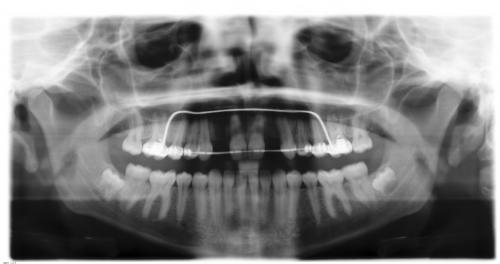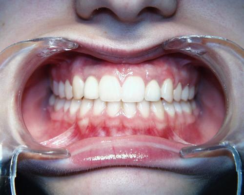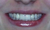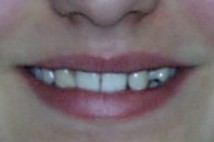 Ein oberer Eckzahn war zu einem früheren Zeitpunkt vom Hauszahnarzt verbreitert worden, um eine besonders auffallende Lücke zu schließen. Die Situation war aber wegen der Seitenungleichheit, der atypischen Zahnformen und der noch vorhandenen Lücken immer noch unbefriedigend.