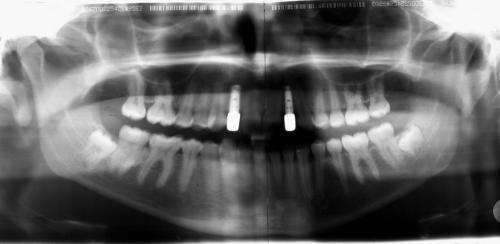 In diesem Beispiel wurden bei nicht angelegten seitlichen oberen Schneidezähnen die Lücken geöffnet und später künstliche Zahnwurzeln aus Titan mit aufgesetzten keramikverblendeten Kronen (sog. Zahnimplantate) eingesetzt.
