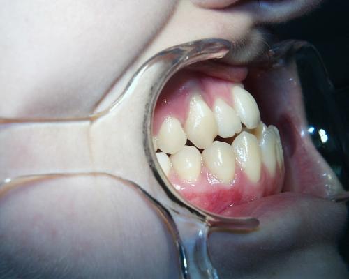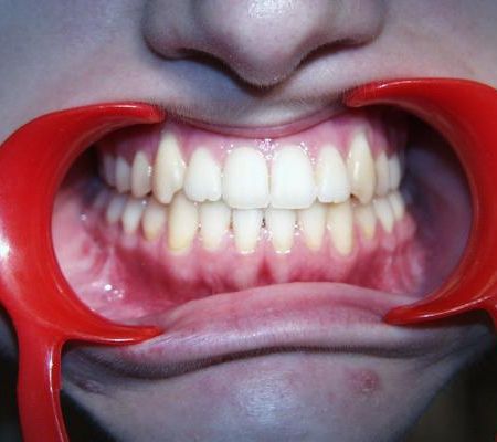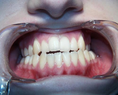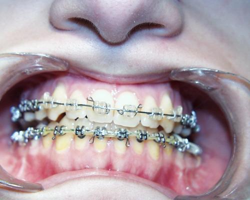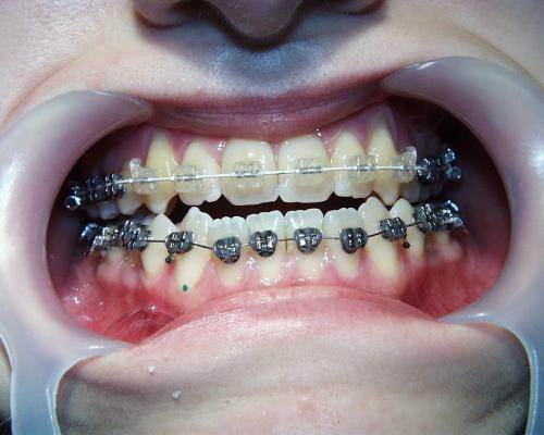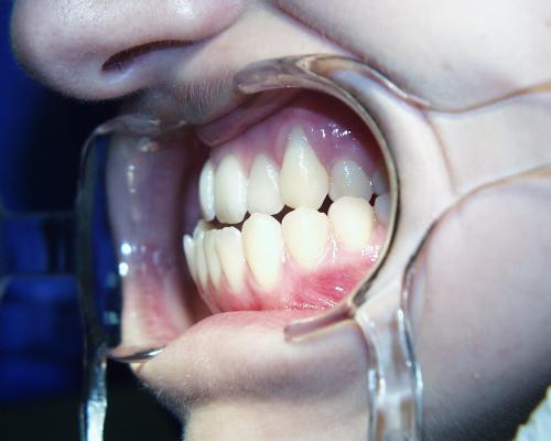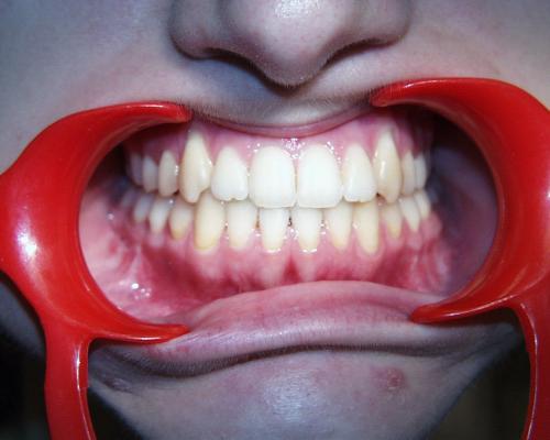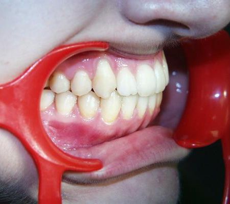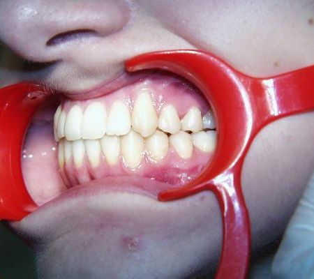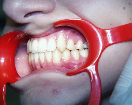 Linkes Bild kurz vor, rechtes Bild kurz nach der Operation. Häufig ist noch eine weitere Anpassung der Zahnbögen und eine Feineinstellung der Verzahnung notwendig. In der Regel müssen die Patienten zwischen den Zahnreihen kleine Gummiringe einhängen, um die Kiefer in der gewünschten Position zu halten.
