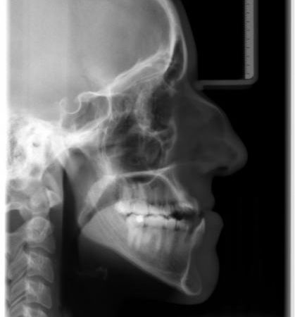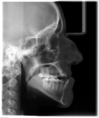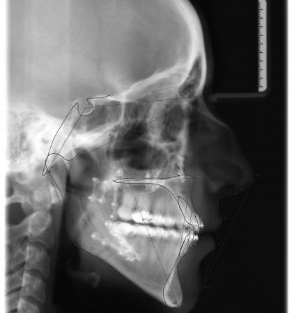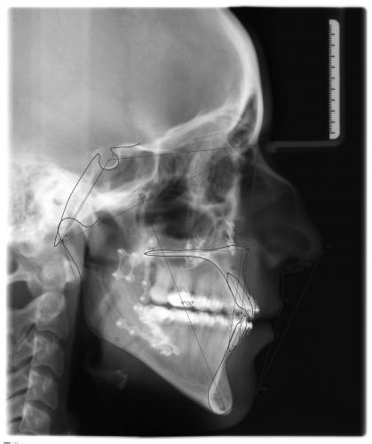 Auch diese Patientin wurde kombiniert kieferorthopädisch-chirurgisch behandelt, in diesem Fall wegen eines zu weit vorstehenden Unterkiefers und eines frontoffenen Bisses. Die Abweichungen waren zu stark, als daß man allein durch Zahnverschiebungen ein zufriedenstellendes Ergebnis hätte erzielen können. Die Zahnbögen wurden vor der Operation mit festen Zahnspangen ausgeformt und auf die Zielverzahnung hin angepaßt. Bei der Operation (durchgeführt an der Uniklinik Homburg) wurde der Unterkiefer zurückgesetzt und der Oberkiefer im hinteren Teil etwas nach oben. So konnte die Lagebeziehung der Kiefer sowohl horizontal, als auch vertikal harmonisiert werden.